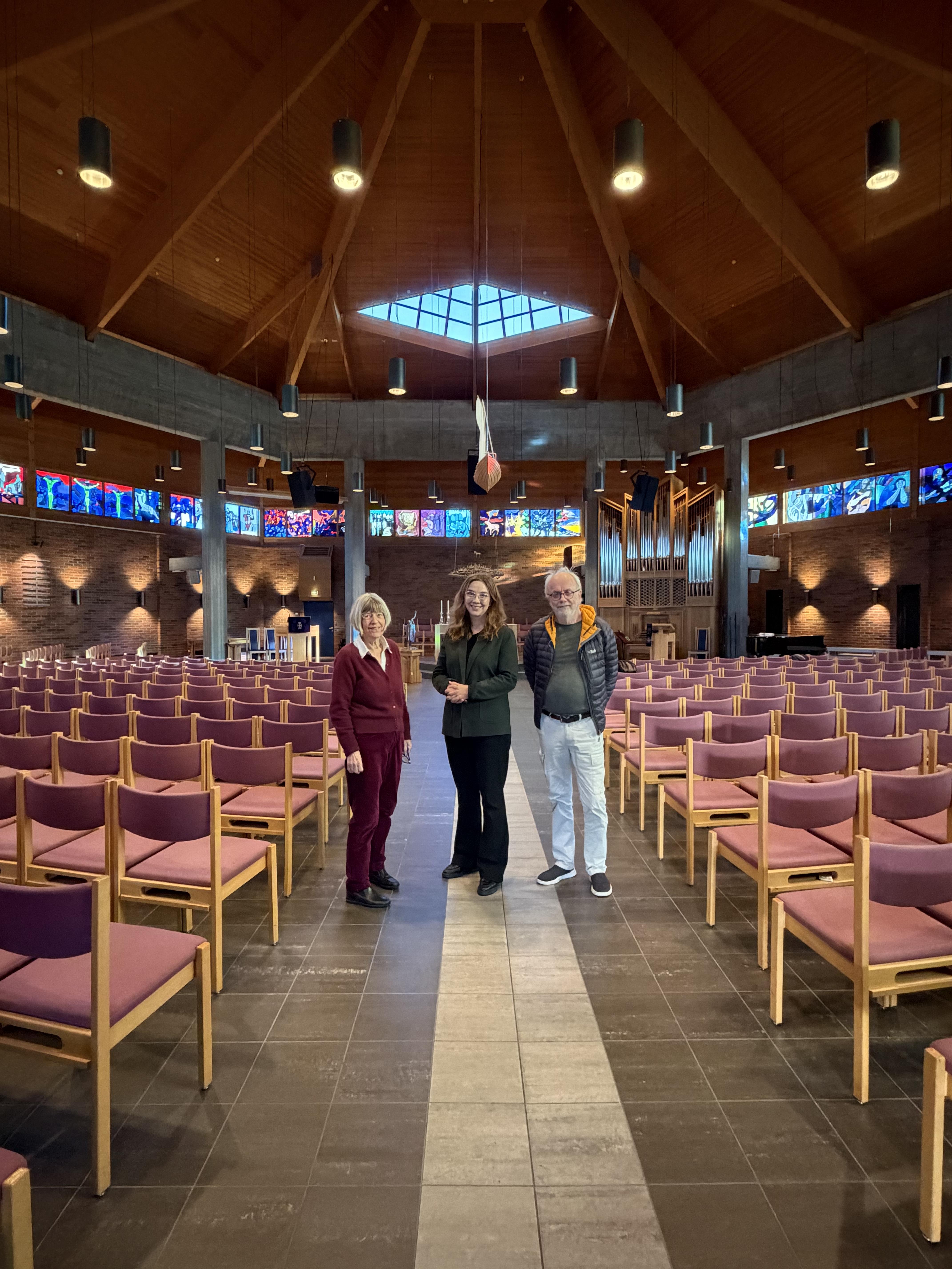 Ingrid Lunnan ble denne formiddagen tatt imot av to ildsjeler i menigheten – Britt Walle Ekroll og Ketil Hjelset – som begge satt i utsmykkingskomitéen da bestillingen av glassmaleriene ble lagt. Dette var en anledning både til å vise frem kunstverket og til å dele historien og meningsinnholdet bak utsmykningen: hva som gjorde at Spjelkavik menighet valgte Bleken og hvordan samarbeidet mellom kunstner, kirke og tydelige lokale frivillige har formet resultatet.